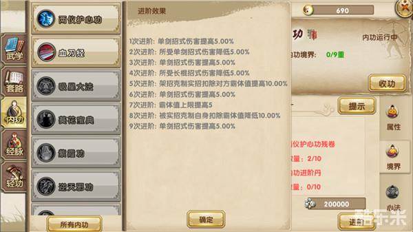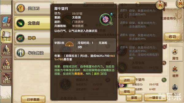 首先我们要了解的是武当的门派定位,武当生存能力强大,门派武学太极剑“天马行空”、“三环套月”拥有极强的的续航能力。而作为整套太极剑中为数不多的亮点,在进阶后进阶点数的运用上首选的肯定就是该气招,其次作为配合犀牛望月这一架招也要点上去。由于武学套路中的架招都有反击减伤一说,几乎每套武学都需要对架招进行升级,毕竟进阶满百分之99的反击减伤简直逆天,在此就不多赘述了。