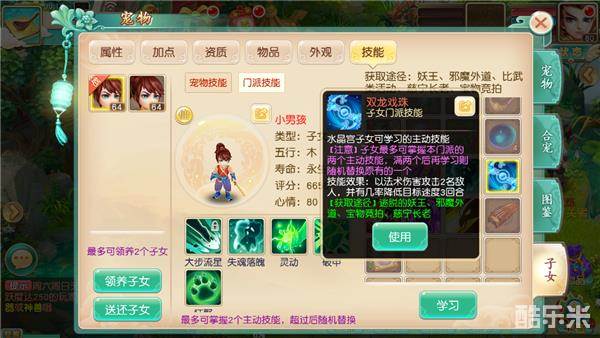 每个子女均可前往门派师傅处拜师,拜师成功可获得该门派的一个被动技能,但是要注意的是,拜师成功后无法更换门派,因此拜师需谨慎哦~子女可学习最多两个该门派主动技能,并且还可学习最多3个宠物技能。