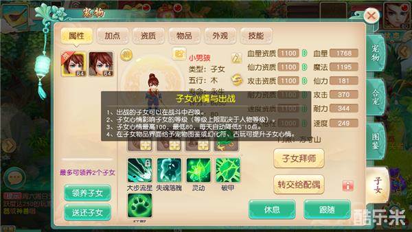 子女拥有和宠物一样的装备系统,并且可穿戴宠物装备。在出战状态下的子女,当玩家战斗时,可召唤前来参战。子女的心情是会影响子女等级的哦,给予子女宠物图鉴、幻化符、古玩可提升子女的心情~