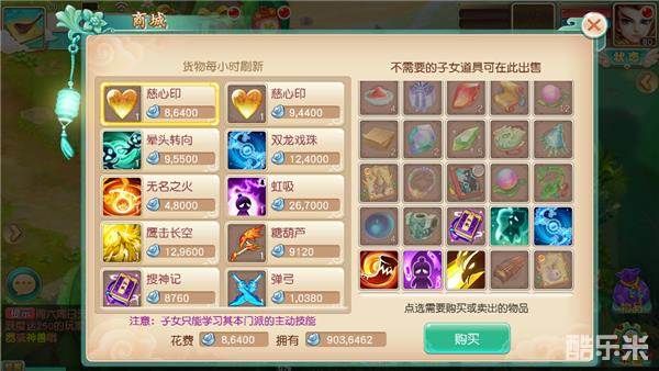 子女还拥有加点、外观、送还、移交给配偶等基本操作。在商城可以购买子女物品,不需要的子女道具也可以在此出售