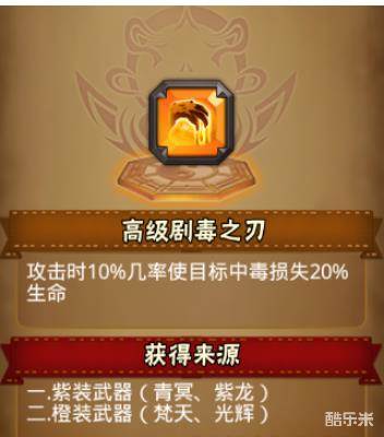 高级剧毒之刃,高级装备特效,攻击时有几率使目标中毒,那么高级剧毒之刃特性属性是什么呢,高级剧毒之刃获得来源有哪些呢,下面和小编一起来了解一下吧。