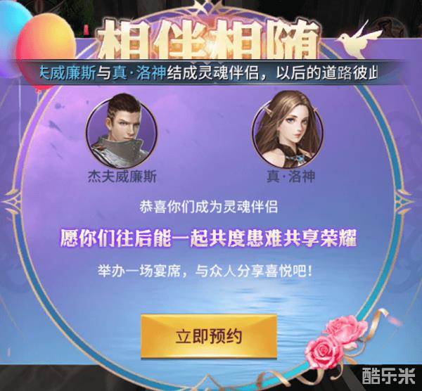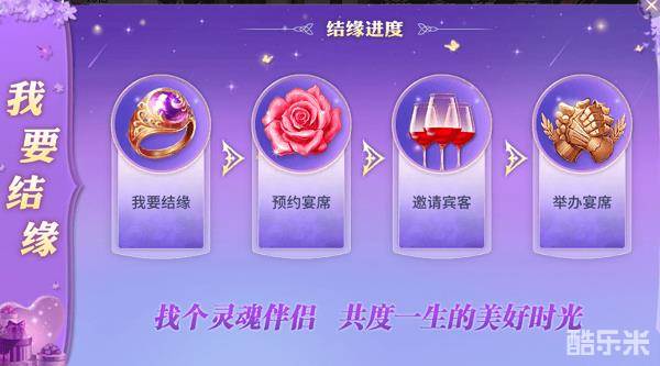 在表达结缘心意得到对方同意后,即可正式结成灵魂伴侣,可通过邮件获得结缘档次的信物、称号等奖励,高结缘档次还有时装领取,两人各一份,后可进入宴席预约。