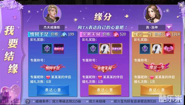 选择“我要结缘”,即可看到结缘的条件:双方等级达到215级,均单身,双方为好友且亲密度为520以上,即可向对方表达结缘的心意,给对方赠送鲜花即可获得亲密度啦。