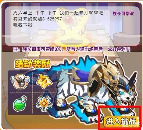 在下面的窗口,可以看到家族的族长发布的指令,然后点击进入挑战