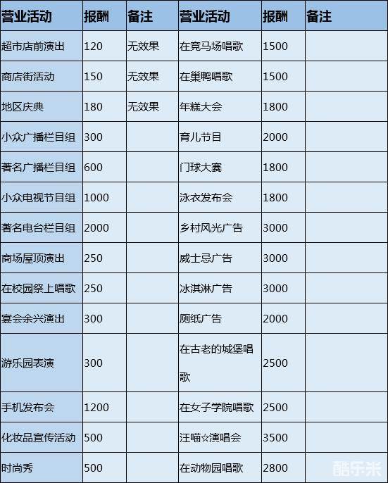在《百万乐曲物语》中,我们旗下的艺人可以参加各种各样的营业活动,这些活动能给我们带来什么收益呢?小编整理了一份营业活动大全,希望对大家有所帮助!