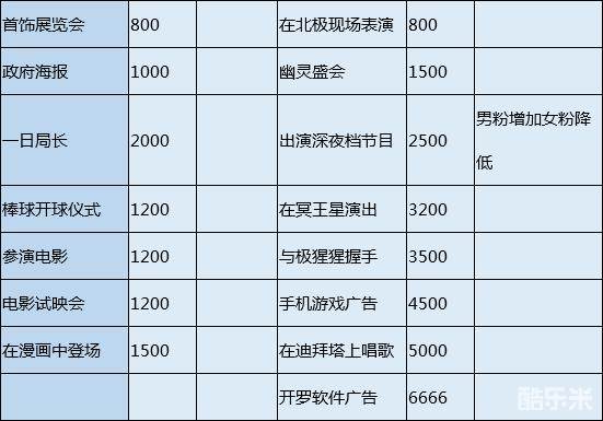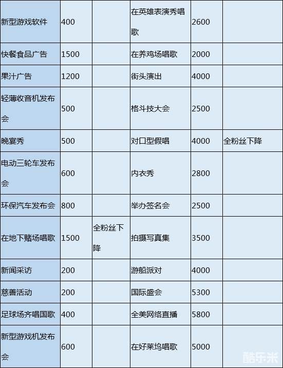 以上就是全部的营业活动啦,注意最开始三种营业活动只会影响酬金,其余所有活动还会影响粉丝数量,尤其打上特殊备注的三个,如果不是很缺钱,千万不要去做哦!