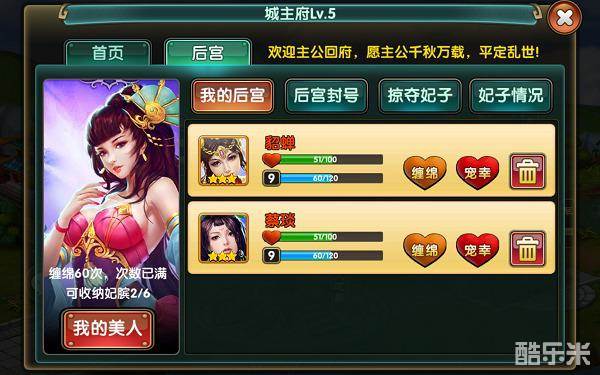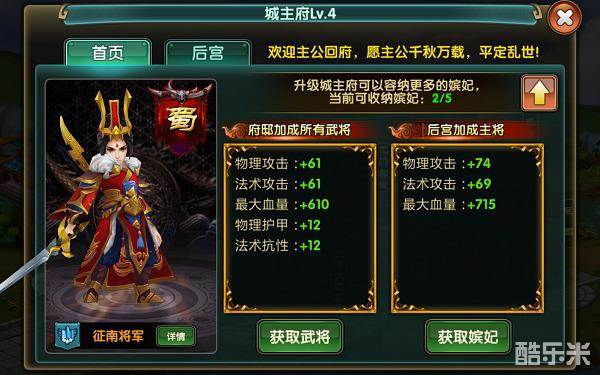 提升主城等级,可以增加武将属性加成的收益,以及可容纳的嫔妃数,各位君主在征战之时,不要忘了自己的后宫佳丽们哦,后宫佳丽越多,对于战斗的帮助也会越大哦。