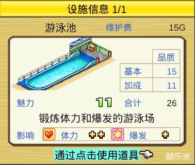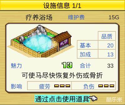 游戏中的训练设施一共有8种:草场、沙土场、坡道场、游泳池、障碍训练场、散步场、放牧场、疗养浴场。