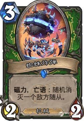 炉石传说的新扩展包“砰砰计划”总共会有135张新卡牌,目前暴雪已经放出了一些新卡信息,下面小编给大家介绍一张猎人新的随从卡:蜘蛛炸弹。