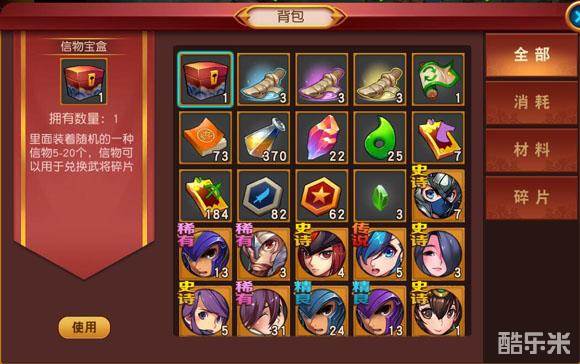 在游戏中背包是每个游戏不可缺少的收纳箱,它可以装下我们所有获得的道具,进入背包的界面中,有详细的分类:消耗、材料、武将碎片,一目了然就能看到背包里所有的道具数量。