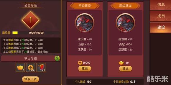 建设分为初级建设和高级建设,每天可以建设三次,元宝建设是高级建设铜币为初级建设,相信不用我说太多大家基本上也都清楚了,那就有大家来探索公会其他的奥秘吧。