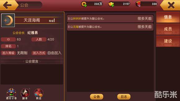 可以清楚地看到工会各项信息 包括公会等级公会ID 排名人数 加入等级 加入方式等,公会副本奖励很丰富,工会商店需要用公会贡献值来兑换里面的商品 商品种类非常丰富 以供大家选择。