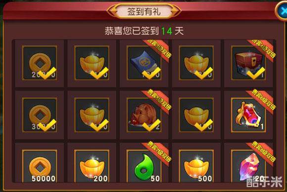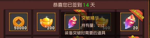 每日日常进入游戏就是进行签到,签到可获得:大量元宝、大量铜币、神器灵玉、突破精华、烤乳猪、未鉴定的高级装备等丰厚的奖励。
