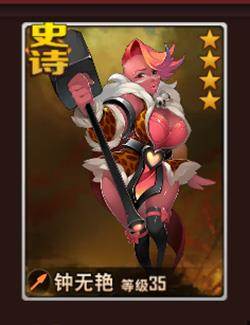 钟无艳在游戏内设定为进攻型枪将,可对范围内的敌方所有目标造成大量伤害,并且眩晕目标一定时间,拥有不俗的防御能力,也是适合放置在前排当肉盾,一点也不亚于龙且。