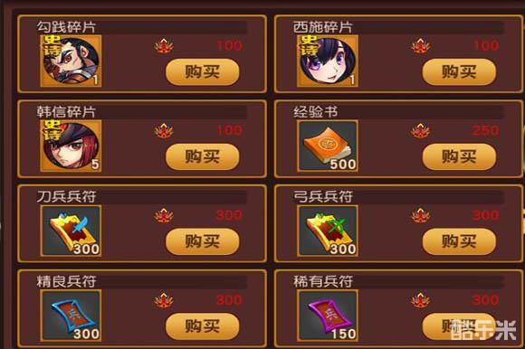 威望商店,可购买武将碎片、经验书、士兵材料等;