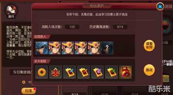 在挑战“兵临城下”前,我们需要根据敌方的武将和阵法信息来调整我方的布阵,尽量选择攻击技能为范围伤害的武将会大大降低通关的难度。