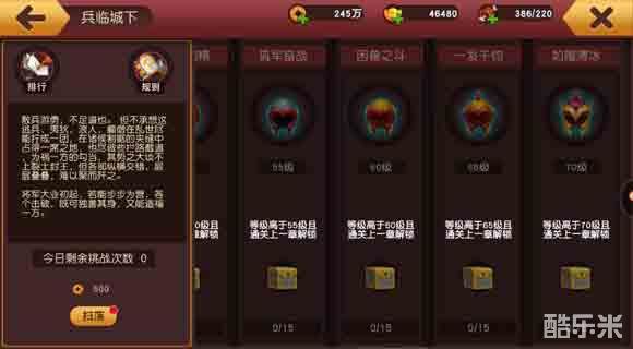 “兵临城下”共有十四个,只有击杀当前难度的所有士兵和武将才算当前难度通关,然后开启下一难度,难度越高,击杀获取威望及其他奖励也就越多每天一次挑战机会,如果通关,会刷新次数,每日可以使用元宝可以再获得一次奖励,性价比很高,并会在凌晨5点刷新充值次数