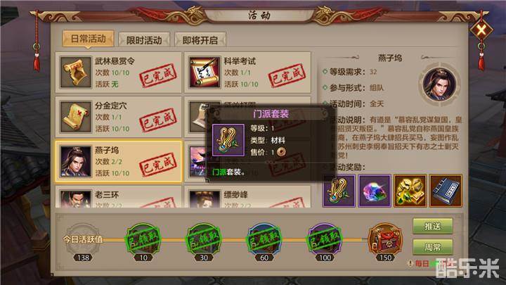 柳暗花明又一村,当达到30级时少侠们就能通过挑战副本任务或者商会购买得到门派套装了,这时候的套装要精致实惠得多。虽然门派套装的属性都是固定的,但星级越高,提升的属性越高。在穿戴2件、4件、6件套装装备时还会有额外的属性加成。会很大程度上提高少侠的战斗能力。这里要注意的是,30、40级的门派套装一套为6件,即使穿满8件套装装备也没有额外的属性加成,所以在30级时可以选择穿6件30级的套装和2件豪侠套装,40级时可以选择穿6件40级套装和2件30级套装,这样可以额外激活一个套装属性,这的确是一个非常理想的选择。