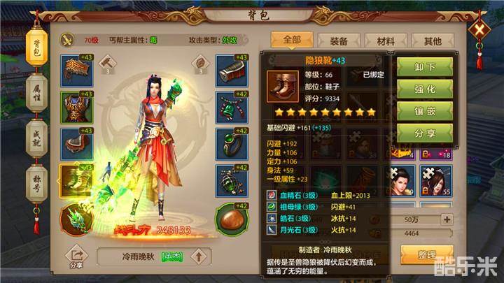 当升级到50时,装备就更加丰富多彩了,少侠可以采摘材料打造令自己满意的装备了。打造的装备都是散件,并没有套装属性,但单件的属性比套装的要强大很多。丐帮是外攻近战门派,所以少侠要选择打造外攻装备。打造装备的属性和星级是随机产生的。为加强丐帮的输出能力和前排能力,就要在属性的选择上着重加强力量、身法、体力、毒攻击和外功攻击。