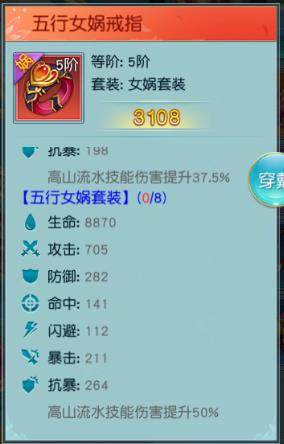穿戴8件5阶“女娲套装”,最高可以将技能【高山流水】的伤害提升50%