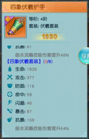 穿戴8件4阶“伏羲套装”,最高可以将技能【曲水流觞】的伤害提升64%