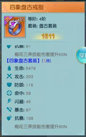 穿戴8件4阶“盘古套装”,最高可以将技能【梅花三弄】的伤害提升80%