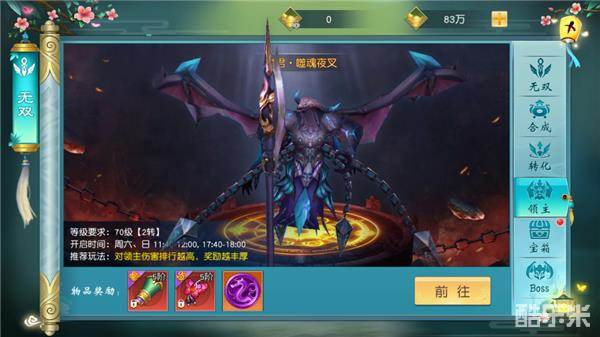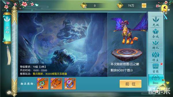 “无双BOSS”参与等级也是70级【2转】,每天10:00~22:00期间的整点在随机地图刷新,在开启时间内所有玩家均可参与击杀无双boss,无双boss产出4阶套装装备,档次就比“领主boss”也低一些。