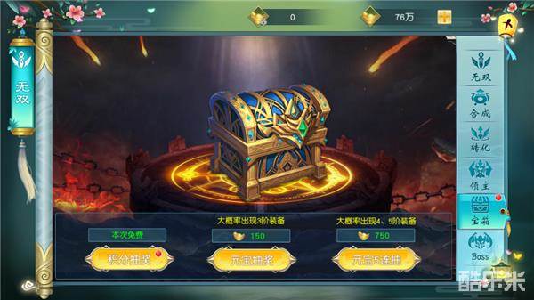 “宝箱”是为没有时间参与击杀boss以及想快速获取无双装备的玩家所准备的福利玩法。玩家在参与击杀领主boss时会获得“无双积分”,可以在宝箱系统通过消耗无双积分来抽取无双装备。