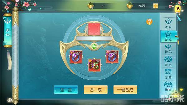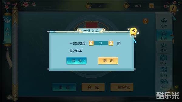 【合成】系统可以帮助玩家快速获得自己想要的阶数。消耗3件任意套装相同阶数的装备,可以合成1件更高一阶的随机套装装备。使用一键合成,则可以快速将所有装备进行更高阶数的合成,节省了不少时间。