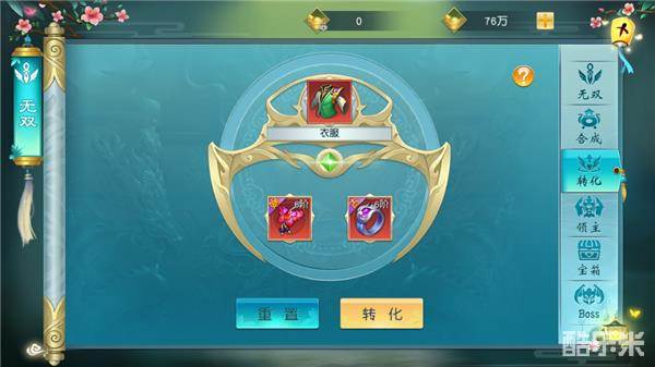 【转化】系统可以快速帮助玩家获得想要的套装装备。2件任意套装任意部位的同阶装备,可以转化成同阶的任意一个指定部位装备,转化后的装备套装归属是随机的。例如选择1件3阶女娲衣服和1阶3阶伏羲鞋子,可转化成1件3阶指定部位但随即套装的装备。