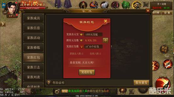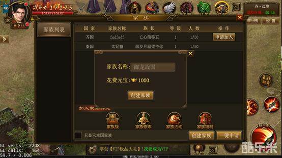 1、玩家55级开启家族功能,VIP2以上玩家可以花费1000元宝创建家族
