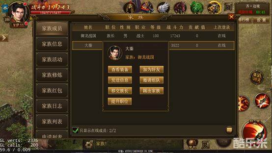 可在家族成员界面查看所有成员信息及在线状态,同时可以进行提升职位、移交族长、踢出家族等操作。