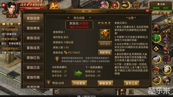 家族信息界面展示家族的基本信息包括,家族族长、家族资金、家族等级、家族属性加成、家族公告。同时可领取每日家族福利、捐献铜钱,族长可升级家族。