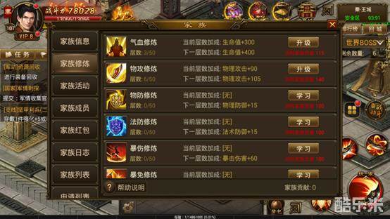 可以使用家族贡献进行家族修炼,家族修炼等级越高,对应属性加成越大,是提升个人实力的不二之选。(退出家族不影响家族修炼)