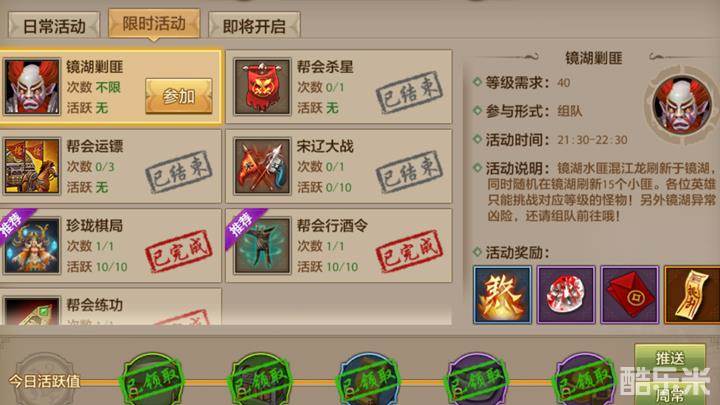 镜湖剿匪活动在游戏中需要玩家的角色等级达到40级以上参加,参与的方式是组队。活动每天共开放三次,分别是是中午13:30、下午17:30、晚上21:30每天3个时间段开放。每次开放时,会在镜湖地图中刷新15个混江小龙,并且在地图中间刷新一只混江龙BOSS。