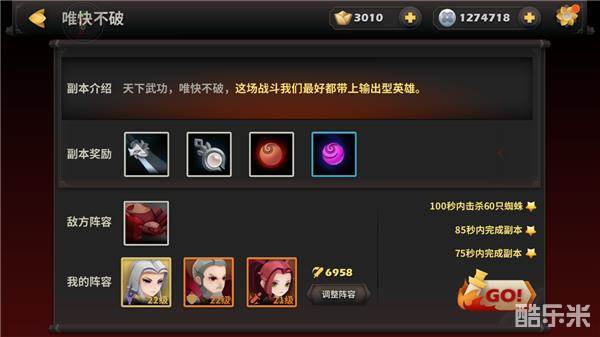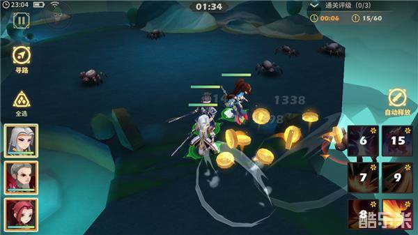 在阵容上尽量选择全高输出英雄,因为小蜘蛛根本没有还手之力。此副本中会有三个小平台,三个平台都会随机生成蜘蛛。玩家需要做的是来回往上下两个平台走动,吸引小蜘蛛仇恨并将其杀害,中间平台的小蜘蛛在玩家通过的时候会一直跟着。杀光一个平台之后随机生成的小蜘蛛千万不要贪心去杀,先放着,到下个平台杀光后再回去宰,75秒内杀死60只小蜘蛛是不成问题的。