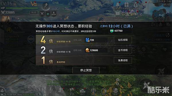 最后还有一个冥想状态,可以进行经验累计,最多可以累计12小时,金币领取2倍奖励、钻石领取4倍奖励,当然也可以免费领取基础奖励。
