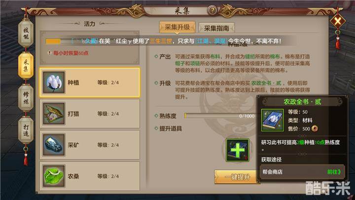 帮会商店出售的4种采集技能书使用后都可以增加相应技能10点熟练度,也就是说如果要1000点熟练度的才能升级的话就需要100本技能书。但是在帮会研究中研究特定科技能提升单次使用技能书获得的熟练度,可以大大减少技能书的需求量。