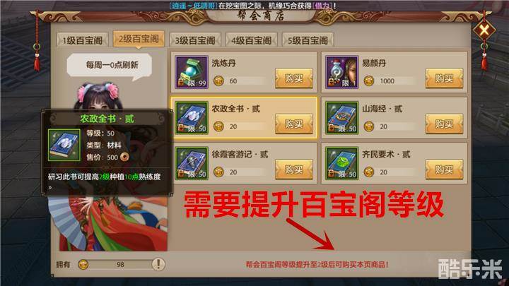 帮会商店又名帮会百宝阁,只有帮会百宝阁升级之后才能购买更多的商品,当我们帮会百宝阁1级的时候,只能购买1级的采集技能书,也就是说顶多能将采集技能提升至2级。此后每提升一级帮会百宝阁等级就可以解锁更高1级的技能书,3级帮会百宝阁就能购买升级4级采集技能的技能书了。所以诸位少侠一定要建设好自己的帮会,来升级帮会百宝阁。