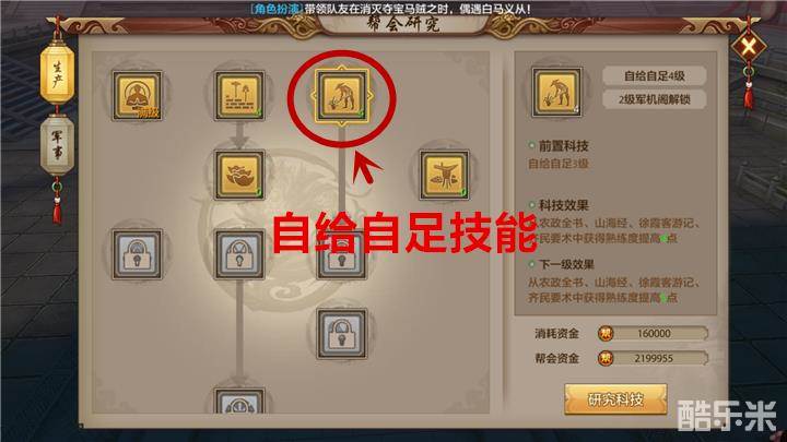 在帮会研究的生产研究项目中,有自给自足这一个科技项目,每升级1级自给自足技能就可以多从农政全书、山海经、徐霞客游记以及齐民要术中获得1点熟练度。自给自足这项科技最高可以升级5级。也就是说满级之后,使用1本技能书就可以获得15点熟练度了。少侠们购买技能书时一定要记得去看一下帮会里自给自足科技的等级,要不技能书买多了,可没地方退货哦。