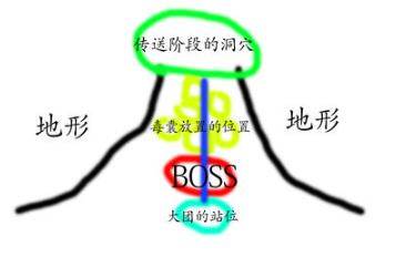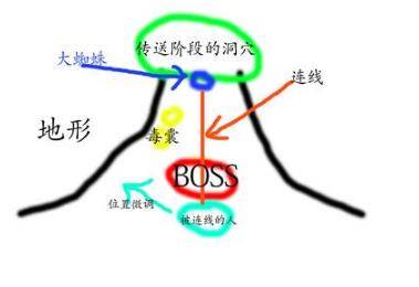 这个阶段需要注意的就是被连线的玩家不能靠近大蜘蛛,如果大蜘蛛过来找你的路线上地上没有毒囊炸到他这个时候被连线的人自己微调一下位置让蜘蛛找你的位置改一改让他中毒囊。下面是图例