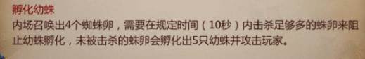 孵化蜘蛛这个技能就是上面看到的内场四个地上的蜘蛛蛋。这个技能可以忽略,知道这个技能在什么地方,技能机制什么样就行。
