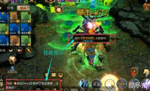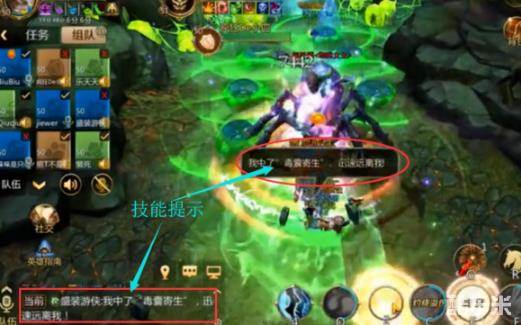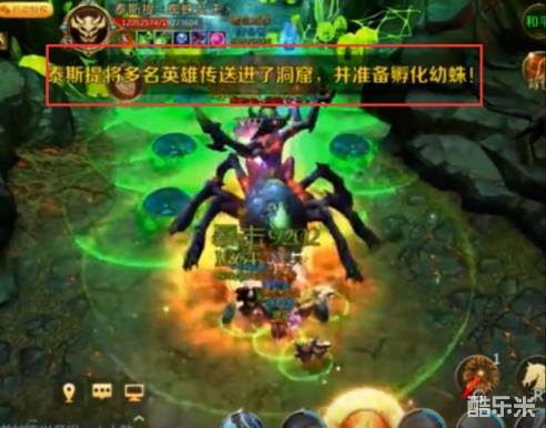 传送技能会在屏幕上方提示一排字体(泰斯提将多名英雄传送进了洞窟,并准备孵化幼蛛)