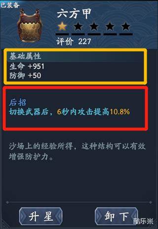 防具与武器类似,所有防具的基础属性在论剑天梯中都是拉平的,与防具品质、星级激活均无关(黄色框内容)。