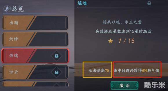 在兵器谱激活总览后获得的击中获得怒气,受击获得怒气,毒抗,火抗,暴击伤害和受到暴击伤害均属于红色词条,会带入论剑(图中红色框内属性)。
