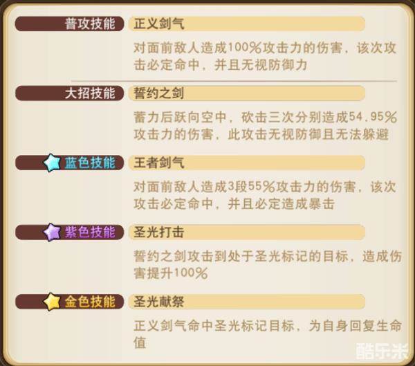 骑士女王的技能可以造成真实伤害,无视敌人护甲,可以说是非常实用的属性。骑士女王如果进阶到金色技能,正义剑气命中圣光标记的目标,可以为自己回复生命值,攻防一体。