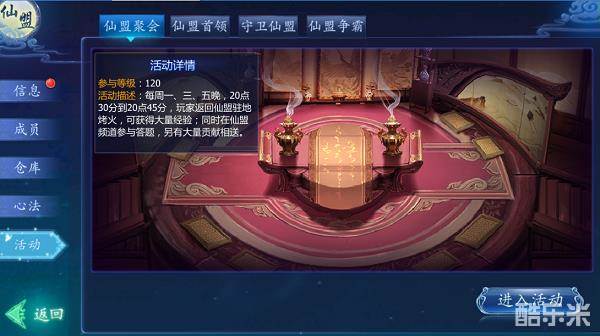 活动说明:道友返回仙盟驻地参与烤火,可获得大量经验,同时在仙盟频道参与答题,另外还有大量的贡献获取哦~