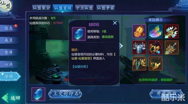 活动说明:通过上缴封印石在仙盟首领活动界面点击上交封印石进入参与,封印石来源于仙盟任务