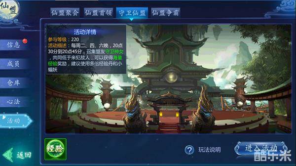 活动说明:召集仙盟盟友守卫神女保卫, 通过击杀三条路过来小怪,保护仙盟神女和护法,当护法存活的时候经验加成更高,活动期间若仙盟神女死亡则守卫失败。