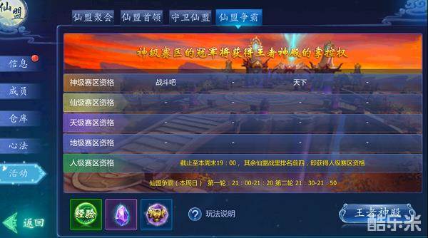 7.人级赛区资格在么次活动前重置,由其余仙盟中战力前4名活动